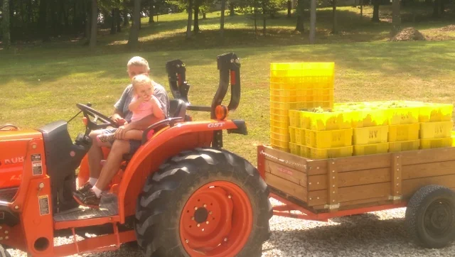 Dad and the small human posing for a picture before taking the grapes to the barn.